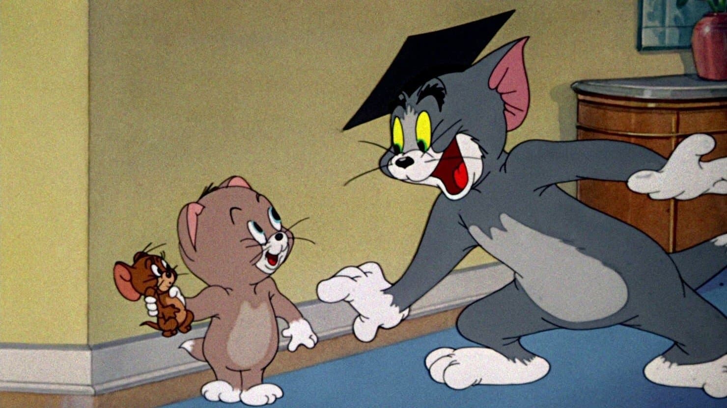 Tom, complete with mortarboard, is teaching a kitten the basics: "cats chase mice." But Jerry keeps subverting this lesson at every opportunity.